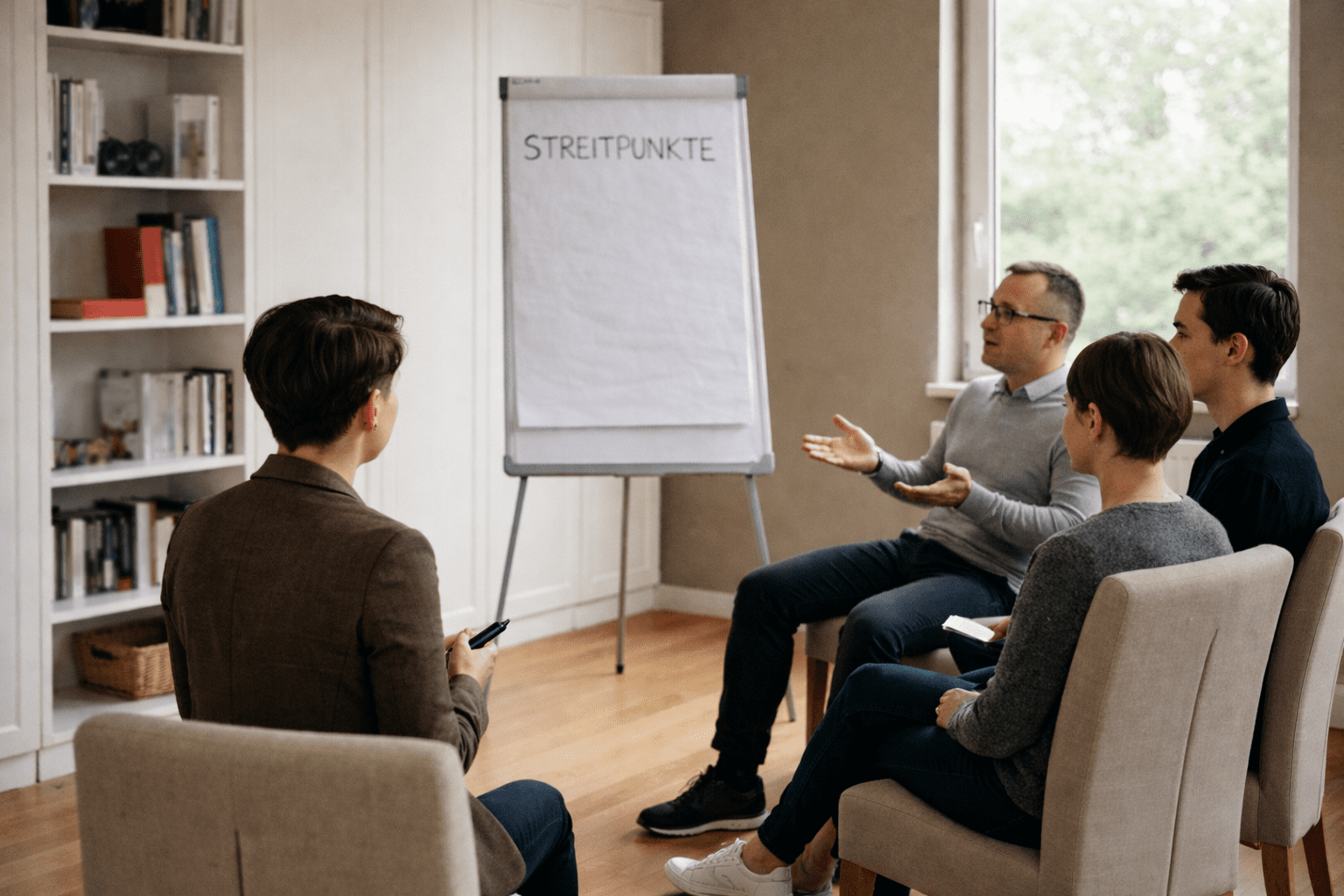 Die Mediation bietet einen neutralen, strukturierten Rahmen, in dem alle Perspektiven gehört werden und gemeinsame Lösungen entwickelt werden können. Anders als in der Therapie steht hier konkrete Konfliktklärung im Vordergrund, nicht die emotionale Verarbeitung einzelner Erfahrungen.